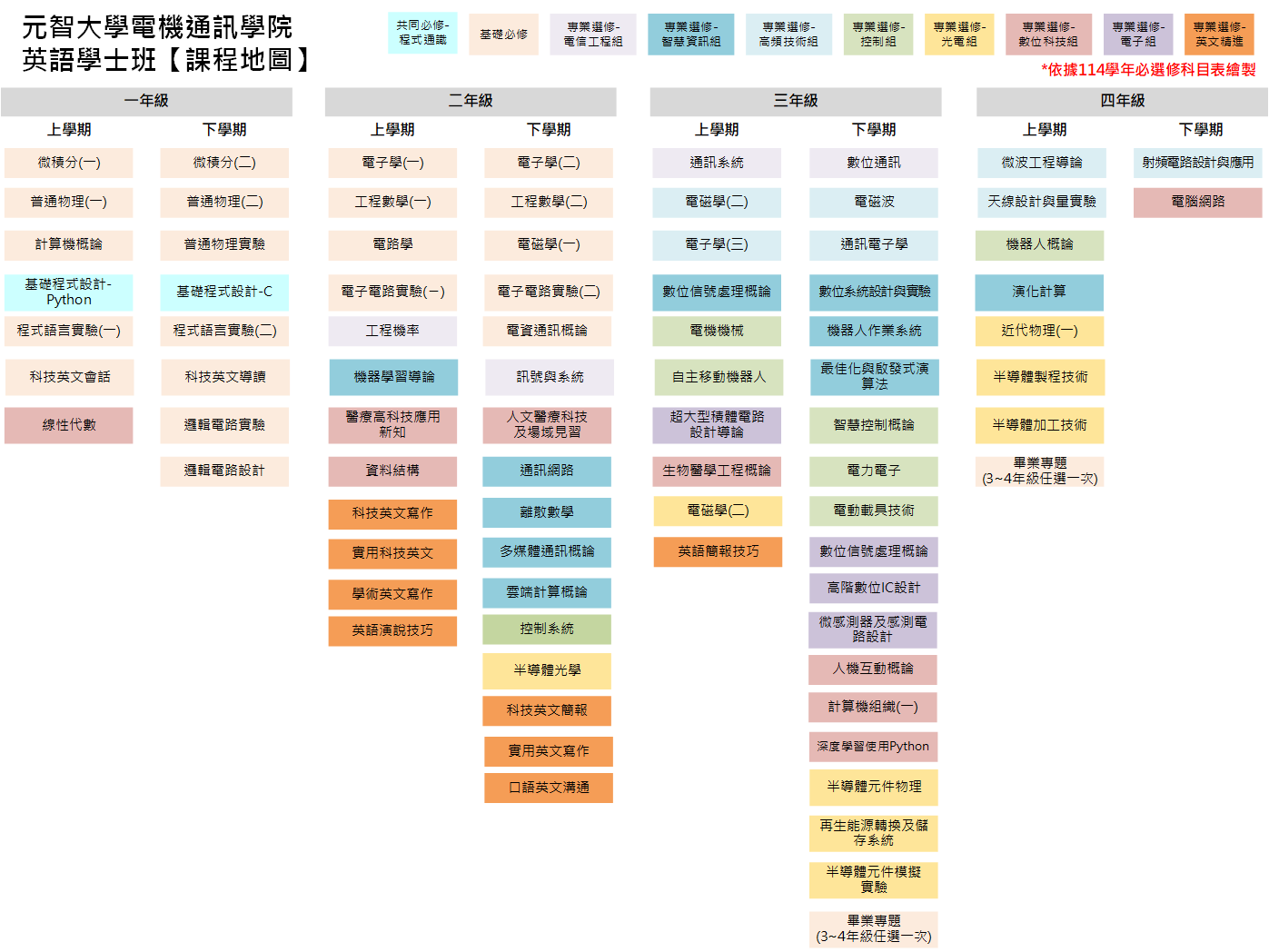 本課程地圖依據114學年必選修科目表(114.12.24一一四學年度第四次教務會議修訂通過)版本繪製,僅列出本班專業課程,詳細請見