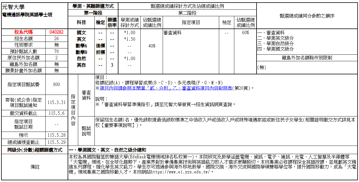 元智大學115學年度學士班特殊選才招生簡章公告